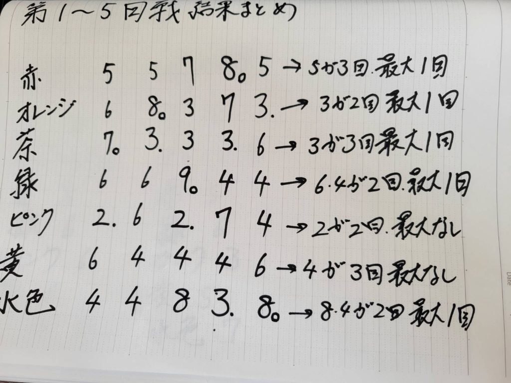 さらに、0粒と1粒がないこと、赤色以外5粒がないことにも気づいた。偶然かもしれないが、今日はその線で予想を立てていく。